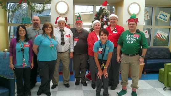 | Chris (KJ4JHT), Francis (KJ4PJH), Bob (KI4QAA), Robert (AG4ZG), Gretchen (KK4ECJ) and Art (KK4ECI) with the Child-Life services crew. |